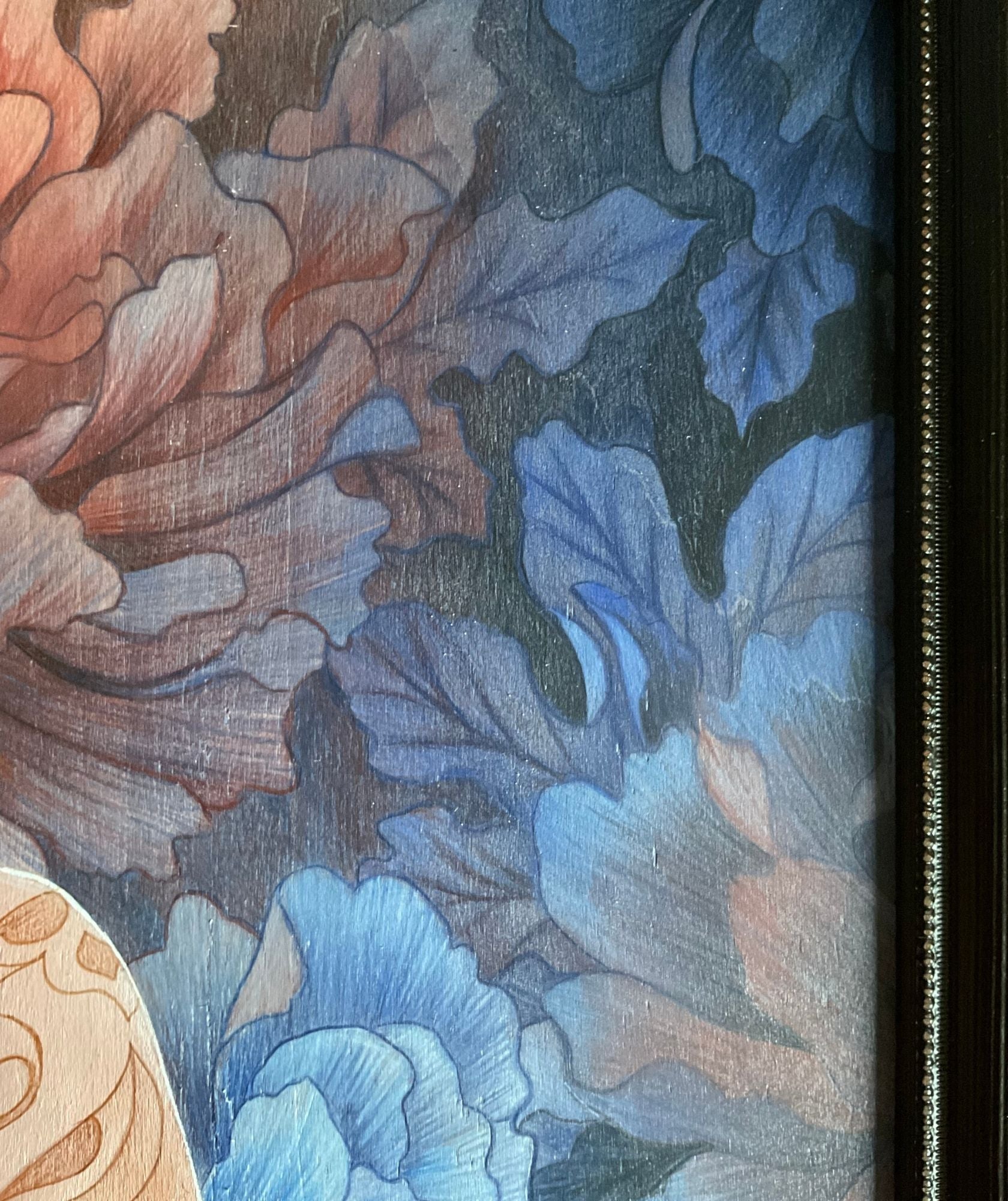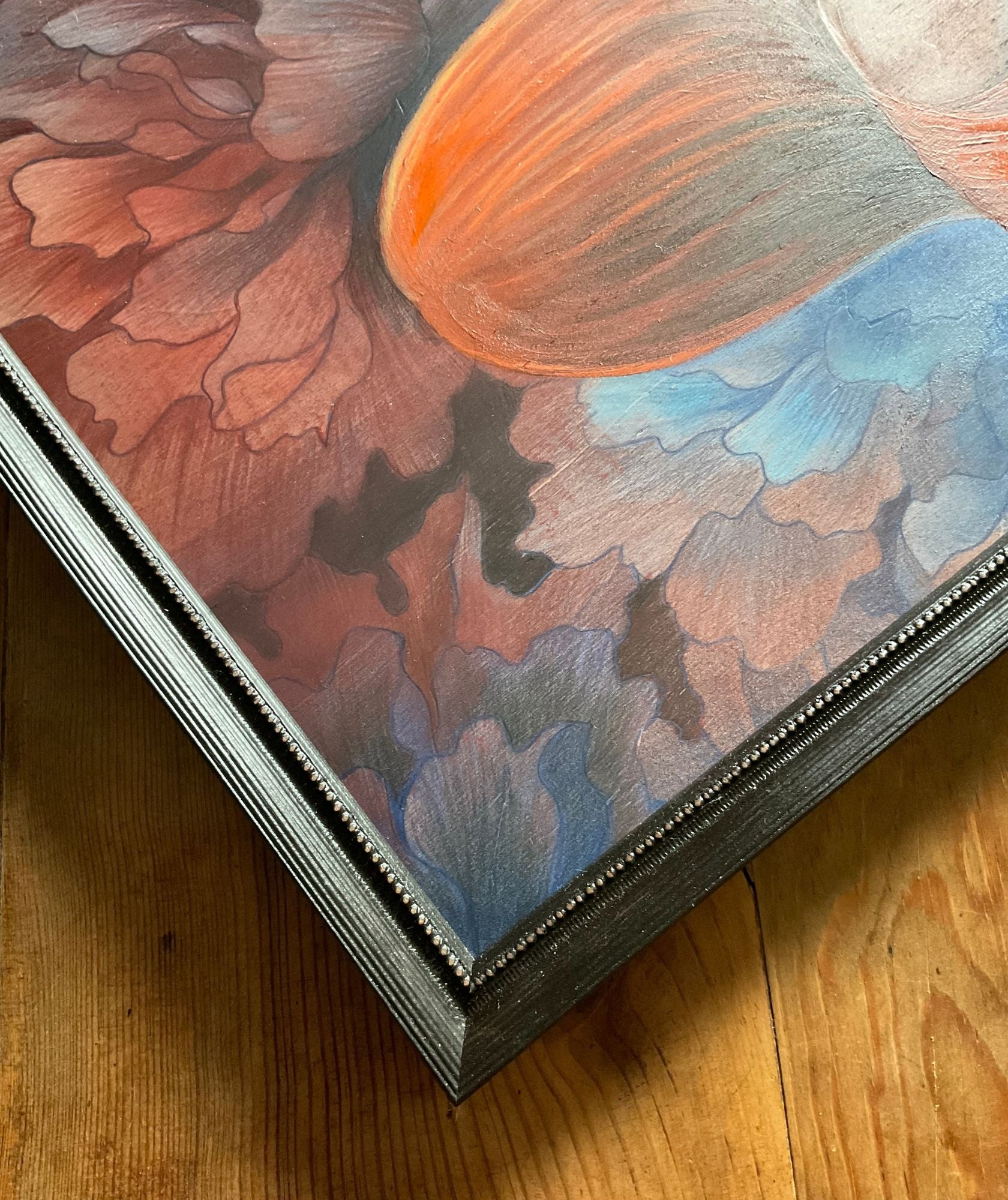Tableau original peint à l'acrylique et crayon de couleurs sur panneau de contreplaqué de 10mm encadré. Dimension 43x63cm cadre inclus.