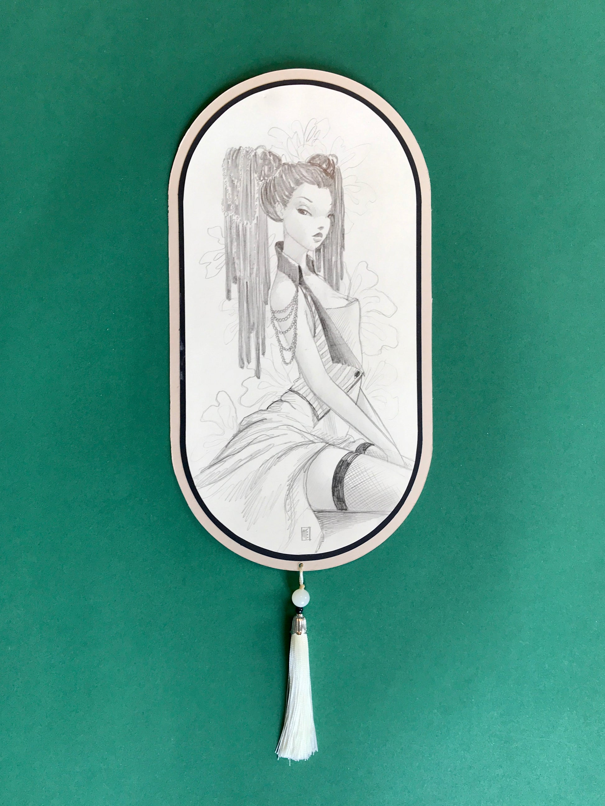 Dessin original décoratif à suspendre, présenté sur un support ovale rigide avec contours doublés. L’ensemble est orné d’une pampille avec perle décorative, permettant une suspension élégante. Parfait pour apporter une touche artistique et légère à un mur ou un espace intérieur.
